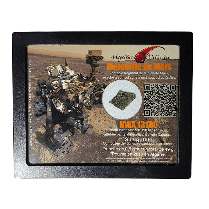 « Cette météorite sous forme de tranche est rare dans une collection et offre une vue unique sur les roches volcaniques vertes de la planète rouge. »