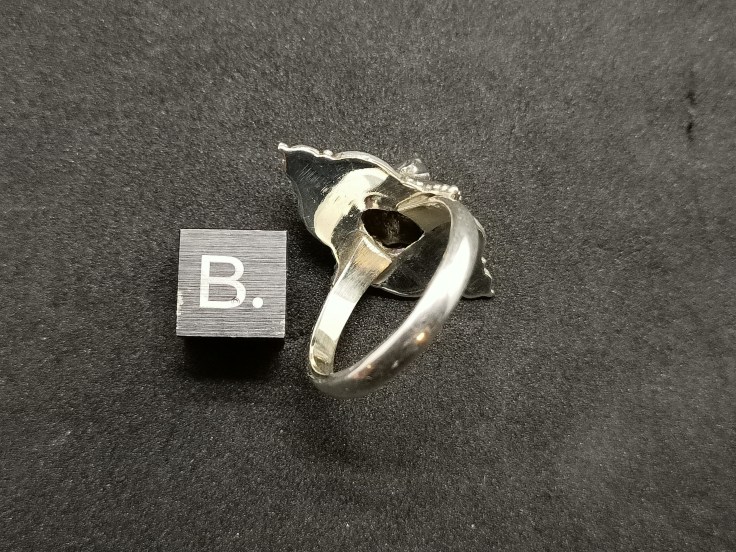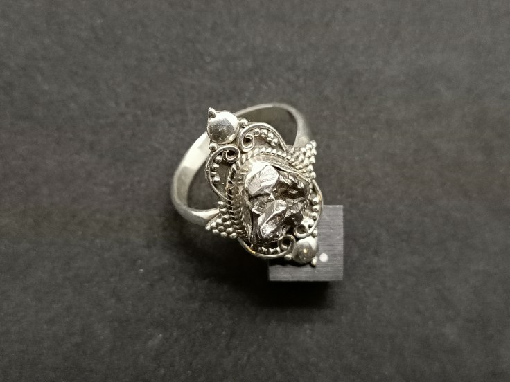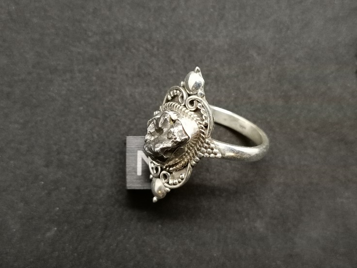 Bague Victoria Campo del Cielo. Une météorite de fer et structure en argent 925. Diamètre intérieur de l'anneau en millimètres 18,5 Dimensions extérieur en millimètres 28.0 * 27.0 * 7.1 85.00 euros * Référence : BAGCAMPO22020 * Frais de port compris.