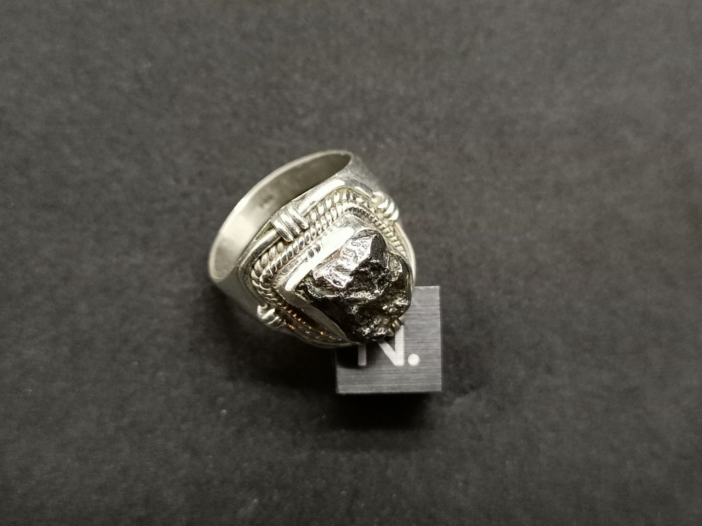 Chevalière Viking Campo del Cielo. Une météorite de type fer et structure en argent 925. Diamètre intérieur de l'anneau en millimètres 17.0 Dimensions extérieur en millimètres 17.3 * 18.5 * 14.5 75.00 euros * Référence : CHECAMPO12020 * Frais de port compris.