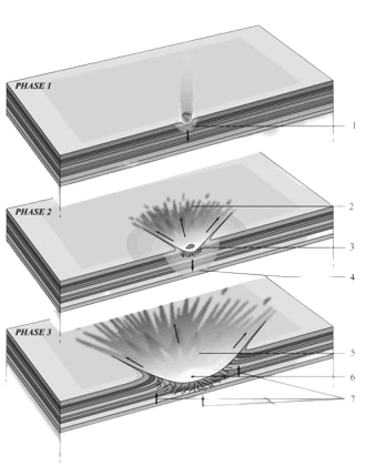 Phase 2 : Le sol est éjecté, il se fracture et se liquéfie, c’est l’intensité maximale de l’impact et de l’onde de choc.