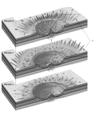 Phase 5 : Le sol éjecté, éjecta, retombe autour du cratère d’impact. Des impactites s’accumulent sur les bords du cratère.