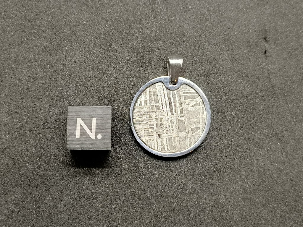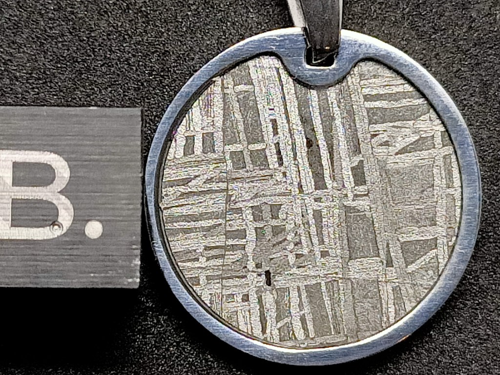 Pendentif Seymchan, rond. Météorite de type pallasite. Dimensions du pendentif en millimètres 20.0 * 20.0 * 2.5 Dimension du passant en millimètres 5.0 50.00 euros * Ref : PENDSEY22020 * Frais de port compris.