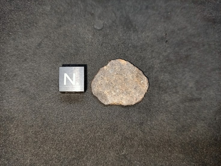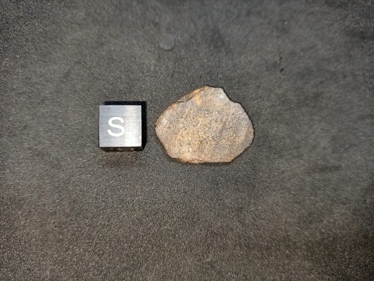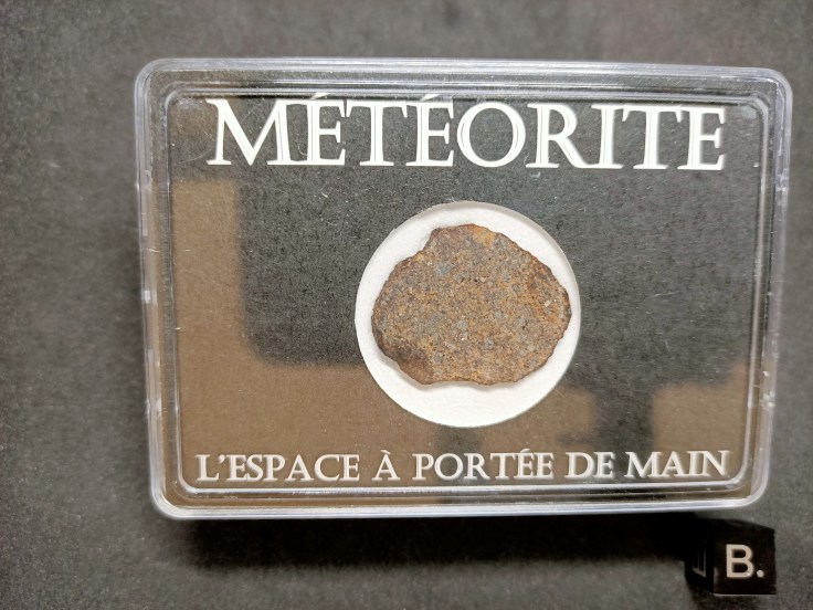 Ramlat as Sahmah, tranche. Météorite de type chondrite. TKW : 3524 grammes. 19/03/2011, Oman. Dimensions 26,3 * 21,0 * 2,3 (en mm) Masse 3,02 g Magnifique petite tranche. 20 euros * Ref : RAST302 * Boite de présentation et frais de port compris.